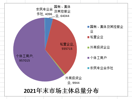 截至2021年年末(统计日期为截至2021年12月22日,下同),全市市场主体总数1590814家,较2020年底(1512000家)增长5.21%。其中企业629703家,下降7.14%,个体工商户957015家,增长15.39%。