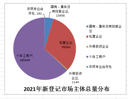 全年新登记(统计日期为2020年12月23日-2021年12月22日,下同)市场主体295504家,较去年同期(246494家)相比增长19.88%,其中企业109663家,增长15.06%,个体工商户185649家,增长23.01%;市场主体注销吊销217105家,增长40.19%。