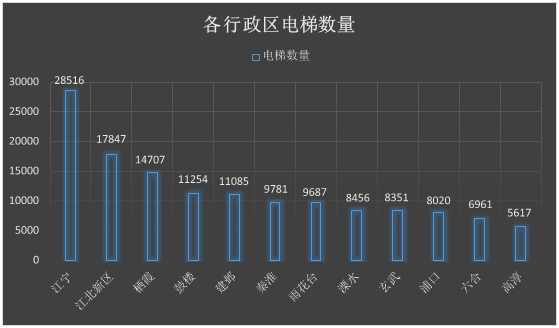 麻豆tv 12个行政区在用电梯分布情况如下,其中江宁区电梯数量最多28516台;高淳区电梯数量最少5617台。