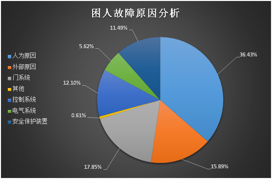 依据《电梯应急处置平台技术规范》(CPASE M001—2019),在人为原因、外部原因、门系统、曳引系统、导向系统、轿厢、控制系统、电气系统、安全保护装置九类故障中:人为原因故障(298起,占36.43%)、门系统故障(146起,占17.85%)、外部原因故障(130起,占15.89%)居前三位,其中生活(装修)垃圾导致开关门受阻困人247起、停电困人66起、门锁失效100起。