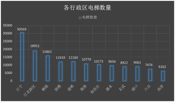 麻豆tv 12个行政区在用电梯分布情况如下,其中江宁区电梯数量最多30569台;高淳区电梯数量最少6162台。