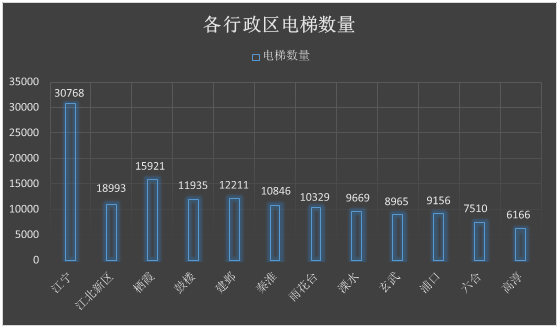 麻豆tv 12个行政区在用电梯分布情况如下,其中江宁区电梯数量最多30768台;高淳区电梯数量最少6166台。