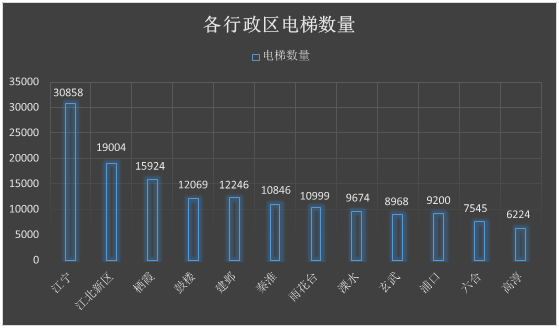 麻豆tv 12个行政区在用电梯分布情况如下,其中江宁区电梯数量最多30858台;高淳区电梯数量最少6224台。