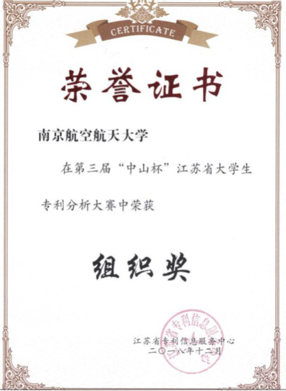 积极组织学生参加江苏省与知识产权相关的各类大赛,获得“第二届江苏省大学生知识产权知识竞赛一等奖”和第三届“中山杯”江苏省大学生专利分析大赛组织奖。2018年,在培训基地的协助下,学校获批“江苏省高价值专利培育项目”。