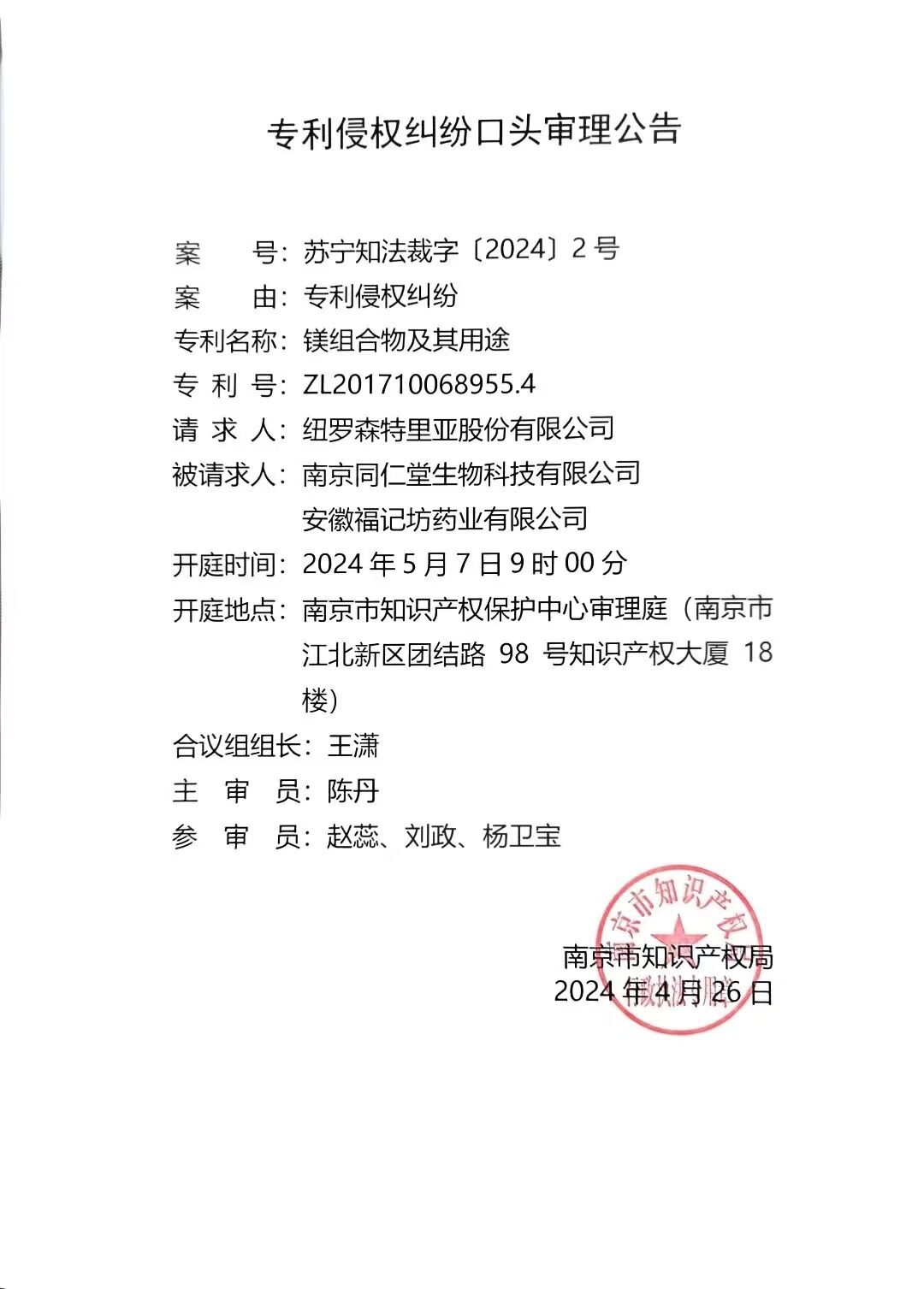 专利侵权纠纷口头审理公告