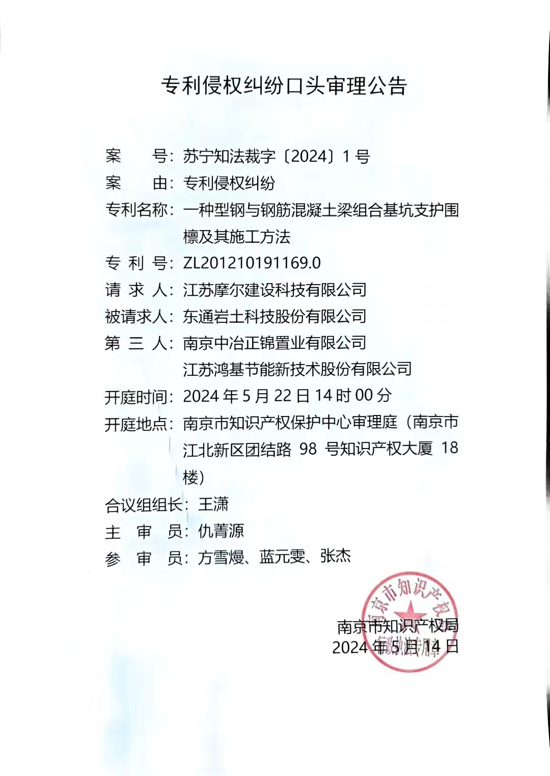 专利侵权纠纷口头审理公告